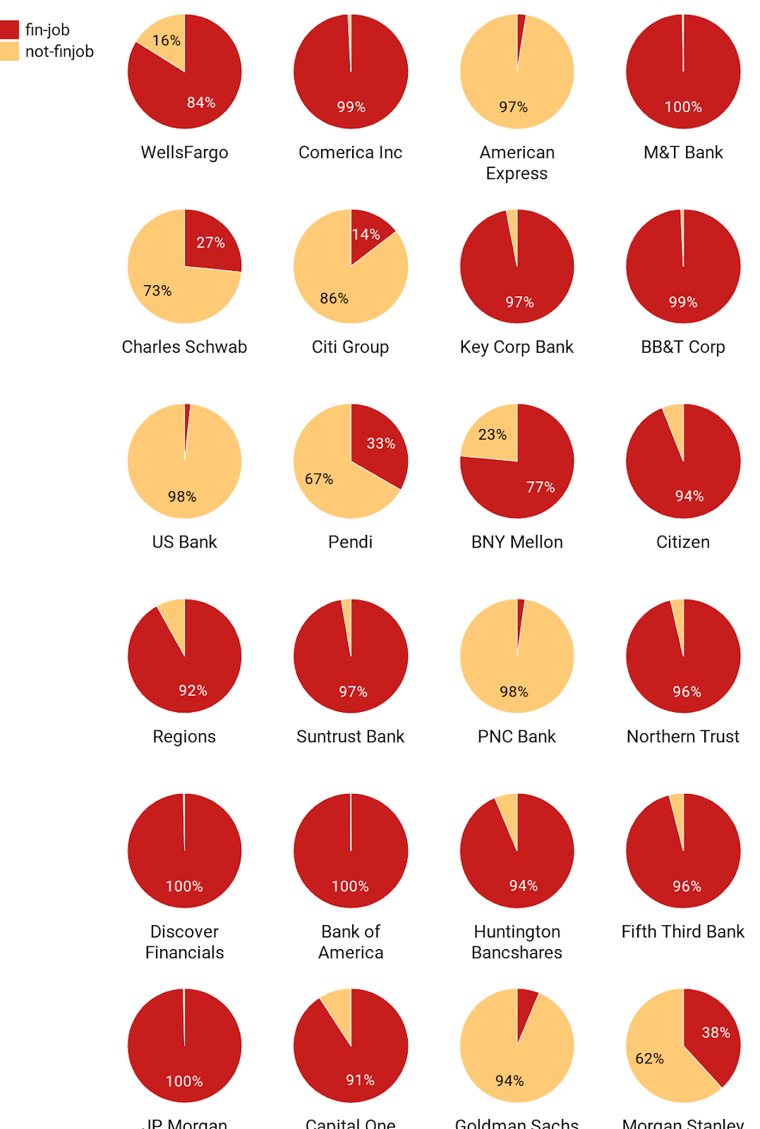 As you can see in these top 24 banks, there are 16 banks which include larger proportion of jobs in Fin-Tech Area than other normal jobs. And among these 16 banks, there are 2 banks' fintech job ratio is between 70%~80%, 16 banks' are above 90%, and includes 4 banks(M&T Bank, Discover Financials, JP Morgan, Capital One) which ratio is 100%.