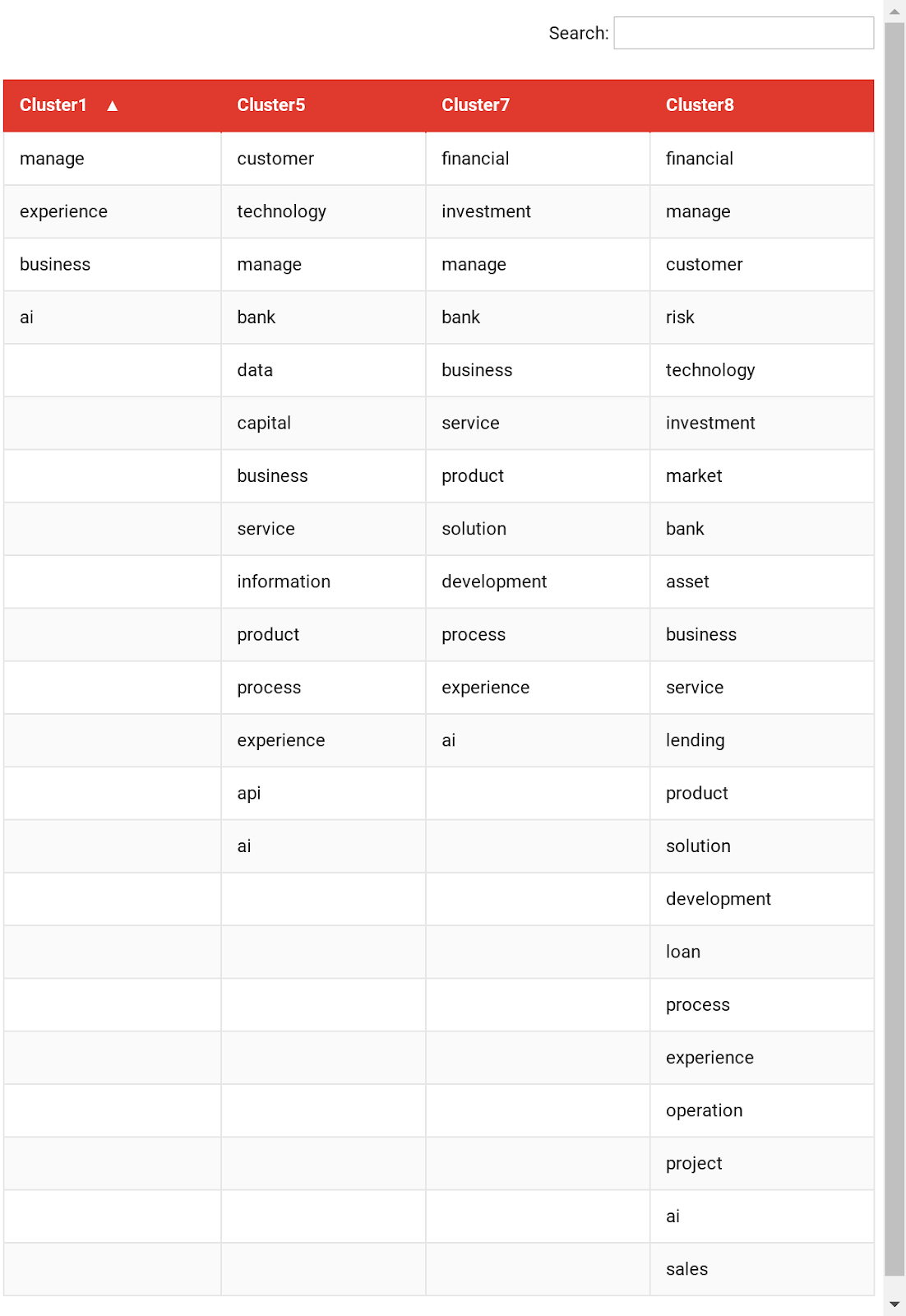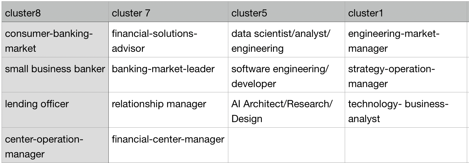 According to the above form, we can give the suggestion from each cluster. For example from cluster 7, we strongly recommend the job seeker to find the job like financial-solution-advisor. And in cluster 1, we can tell him to find the job that is related to the engineering-market-manager or technology-business-analyst.