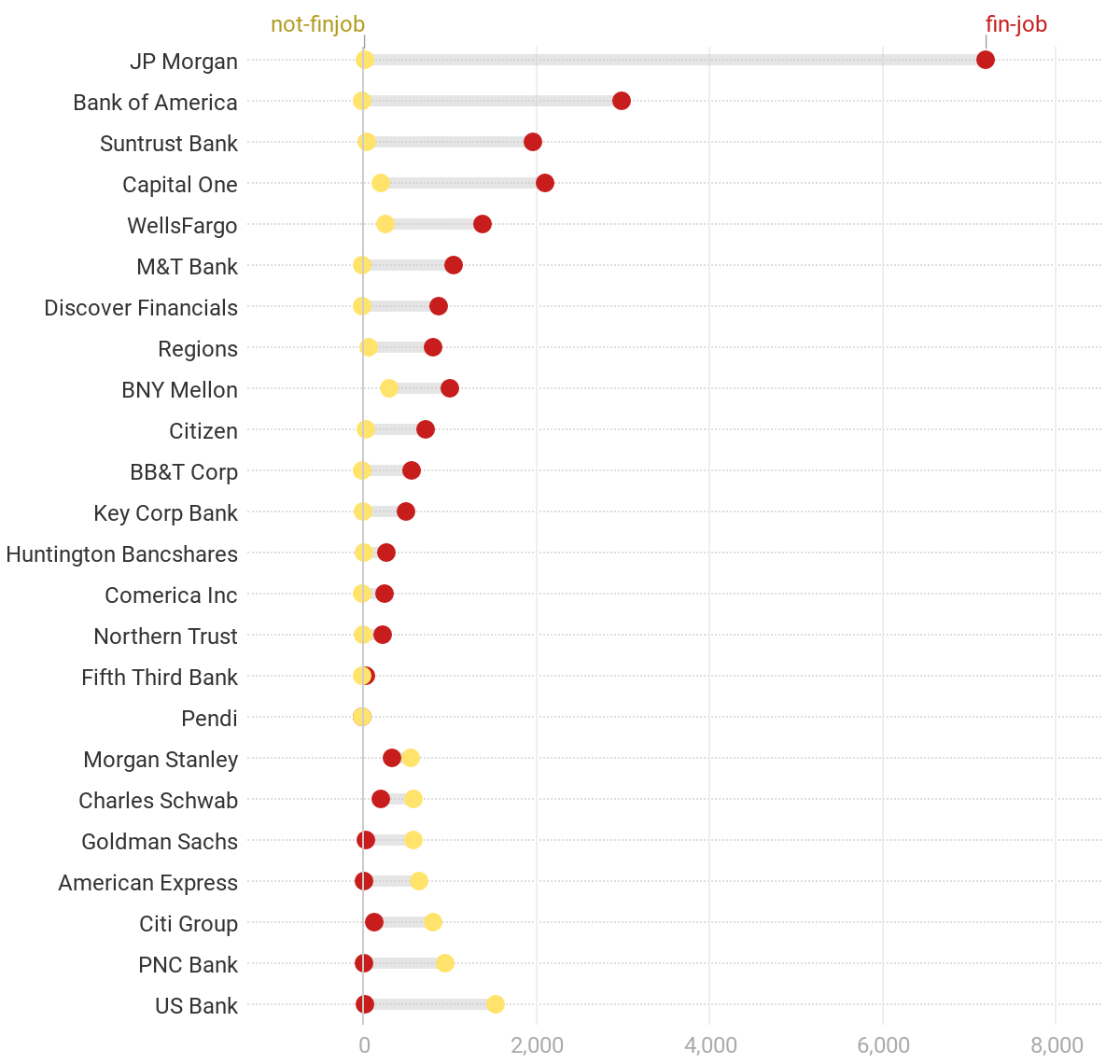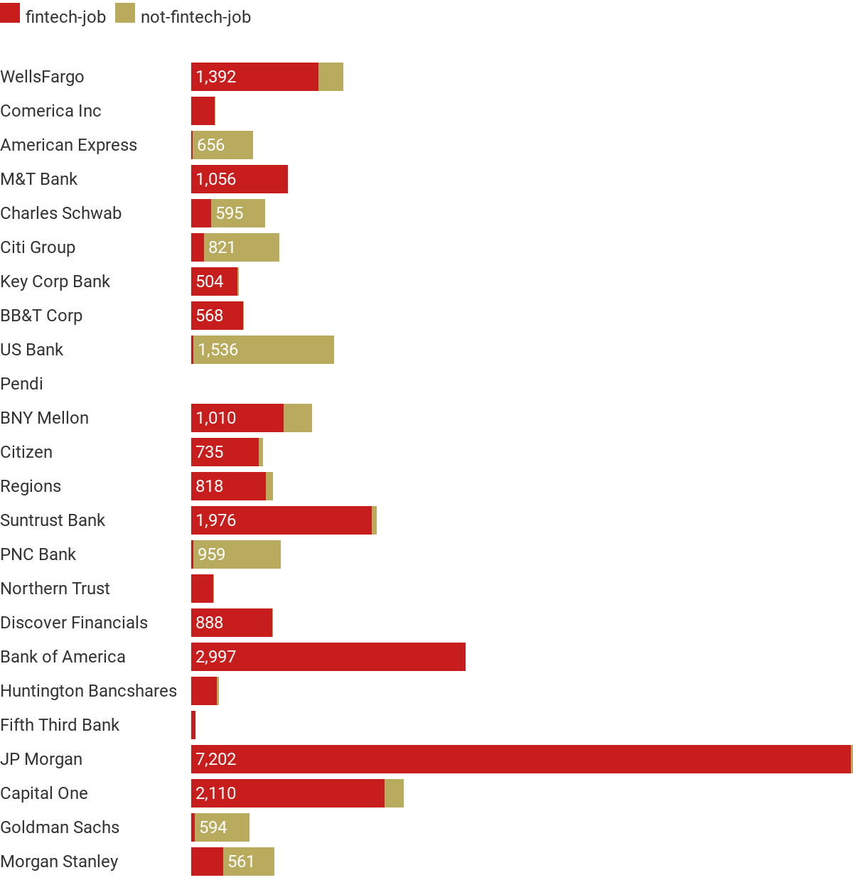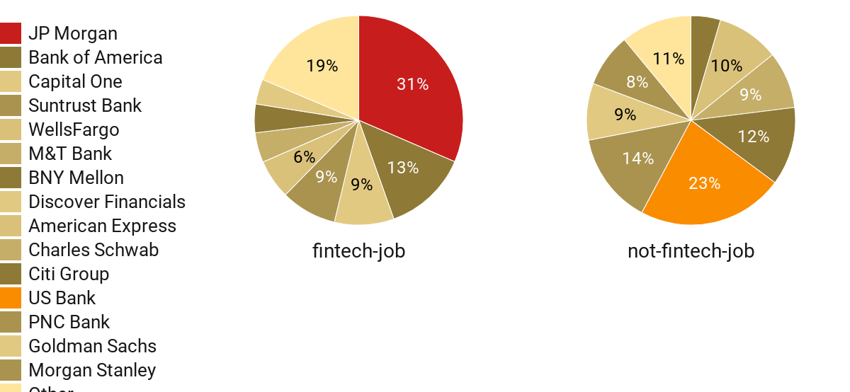 JP Morgan has the most fintech related jobs and Pendi has the least fintech related jobs.