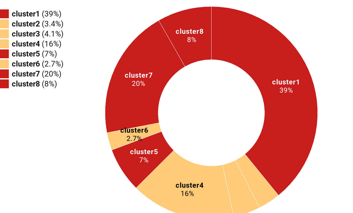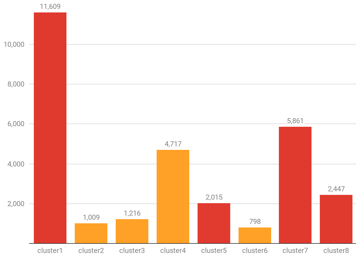 Cluster 1 has the most jobs and cluster 6 has the least jobs.